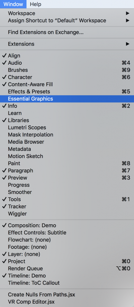 Coincidentally, there is a lot of cool stuff in After Effects. After this article, you should check the windows panel for tools you haven’t used before. I was not even aware the essential graphics panel linked between After Effects and Premiere Pro until seeing it in this menu.