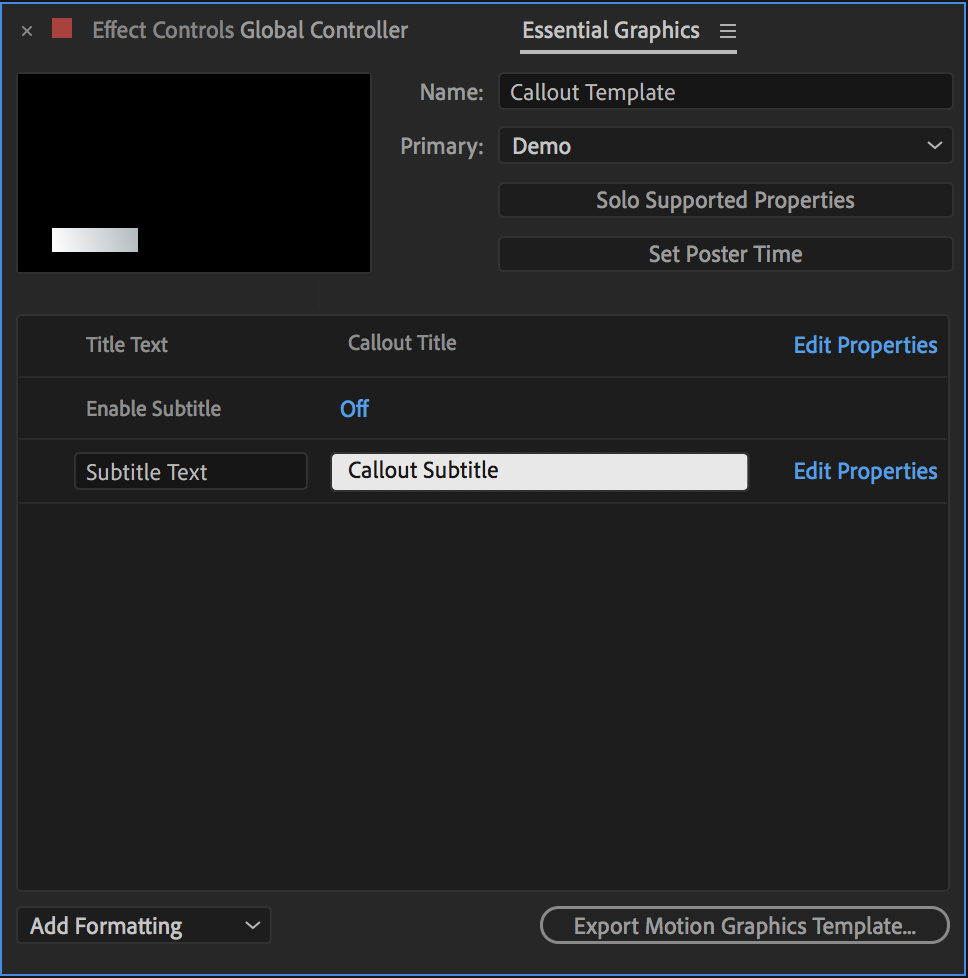 - Allows you to pick a frame from your template to display inside Premiere’s Essential Graphics Panel