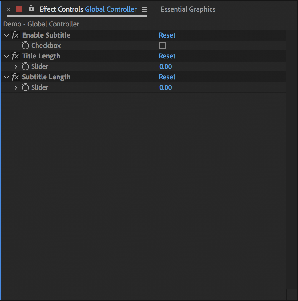 Our global controller will be a dummy null object that contains all the extra options we want to use to control the composition. Some parameters like text are easy, just drag the parameter into the Essential Graphics file and get going, but some attributes like enabling and disabling lines of text, adjusting numbers on screen, etc, are done best with expression controls. Some compositions will have many scripted controls, but for this one in particular, we’ll just need one Checkbox Control effect, to control the visibility of the subtitle. For the purposes of this example though, let’s add 2 more sliders. We won’t expose these to the user- Using scripts, we will set these equal to the length of each line of text. This will help us later with calculating the width of the box. Go ahead and add the source text parameters from the two text areas as well, you can do this by dragging the matching line from the timeline into the Essential Graphics Panel. This is what the Global Controller Null, and Essential Graphics Panel should look like at this stage:
