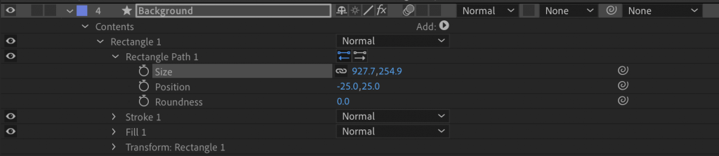 Now that we have both of those values, we can script the background to widen and shorten to the perfect length to match the text. Create a new expression in the size parameter of the shape for the background.
